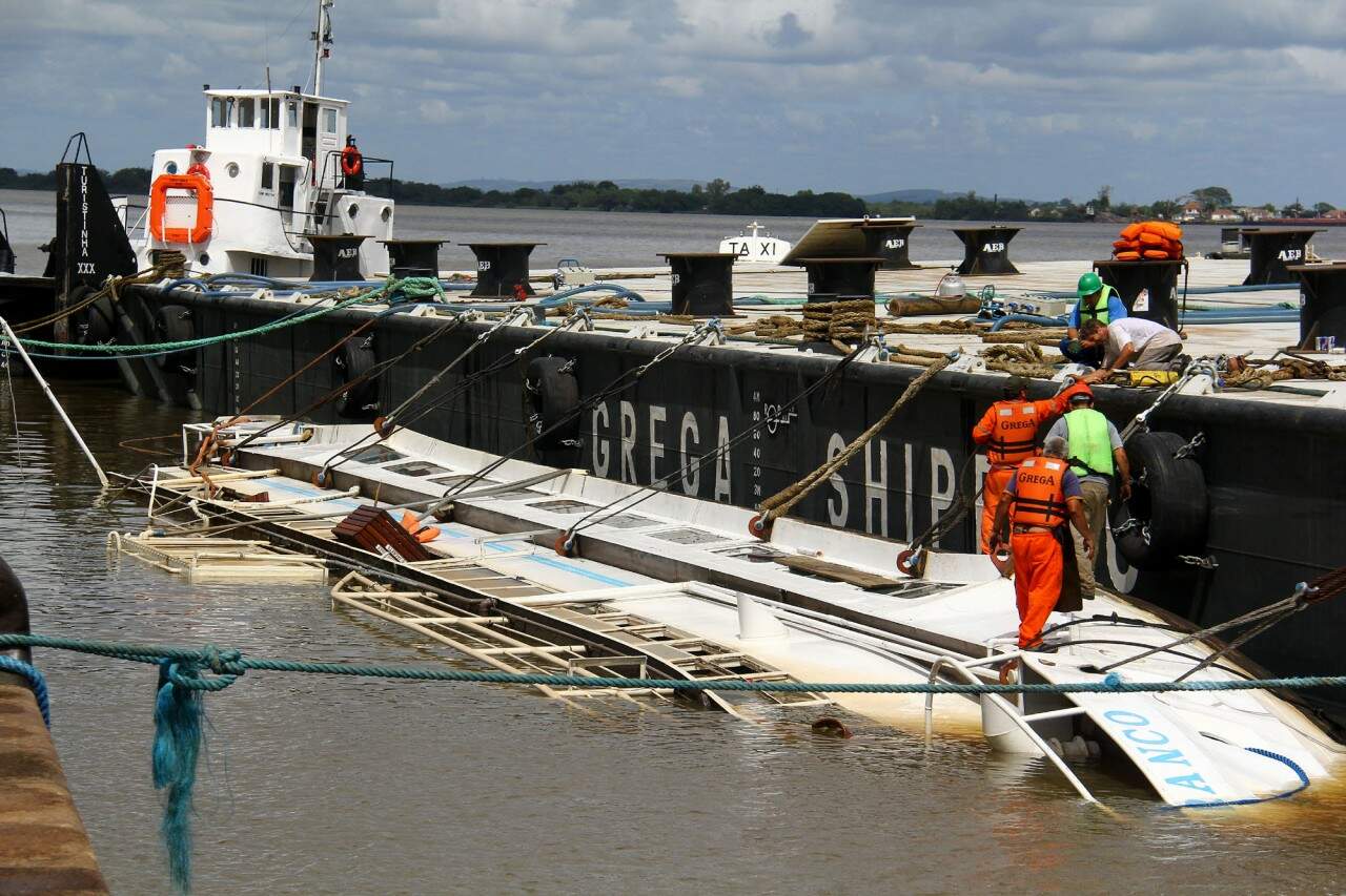 Porto Alegre, 01/02/2016 – Balsa auxilia no processo de reflutuação do Cisne Branco, uma das atrações turísticas de Porto Alegre que virou no Guaíba durante o temporal que atingiu a Capital na sexta. FOTO: LUCAS UEBEL