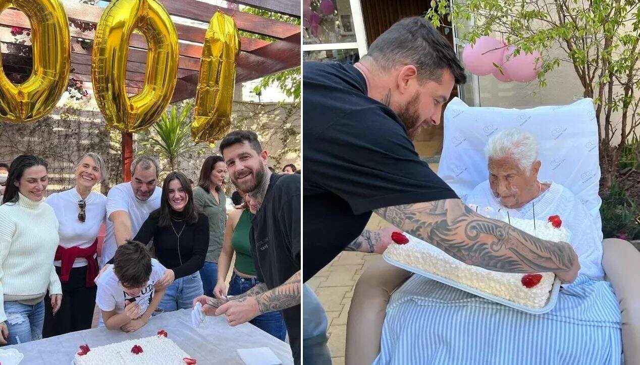 Na comemoração, Cleo se divertiu na companhia do marido e do enteado, Gael. Dona Nina contou com a presença de filhos, netos e bisnetos na comemoração, além da equipe médica que a atende.