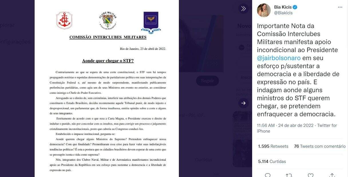 Foto: Reprodução/TwitterUma carta conjunta dos clubes militares das três Forças Armadas, entidades comandadas por oficiais da reserva, faz críticas ao que chama de “partidarismo político” do Supremo Tribunal Federal (STF). No documento, divulgado no sábado (23), os clubes manifestam apoio a Jair Bolsonaro e defendem o perdão concedido ao deputado Daniel Silveira (PTB-RJ) por “sustentar a democracia e a liberdade de expressão”.