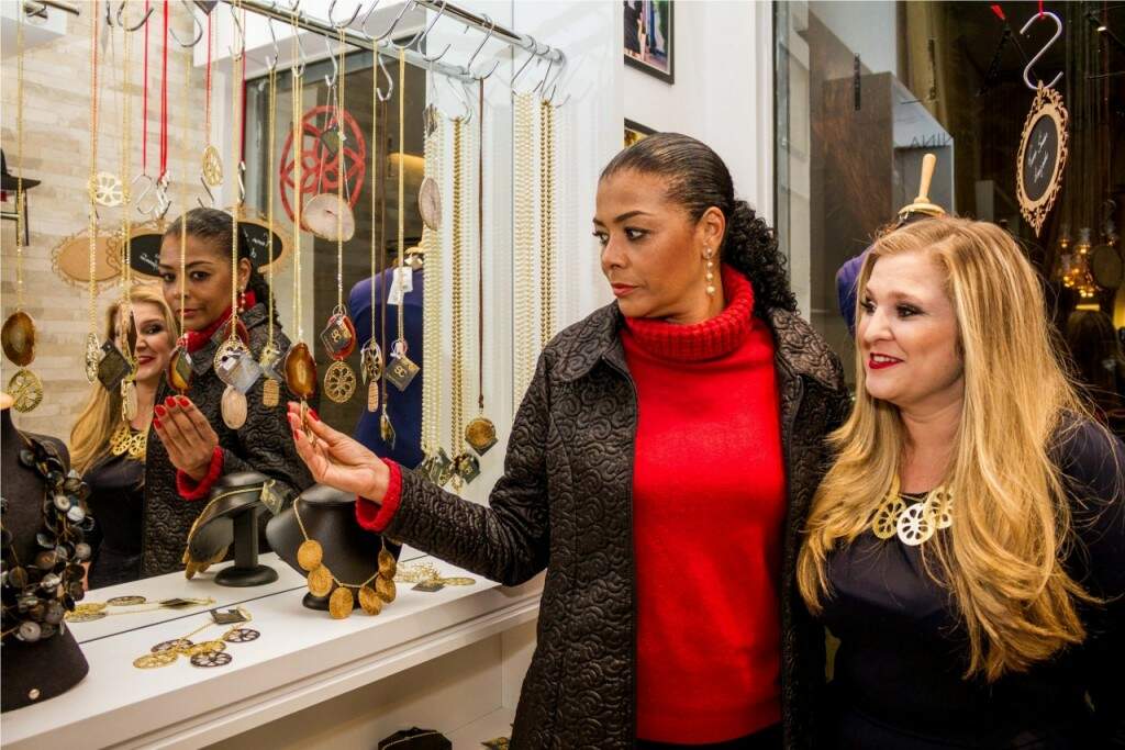 Deise Nunes esteve conhecendo as criações da designer Eliana Colognese. (Foto: Pedro Antonio Heinrich/especial)