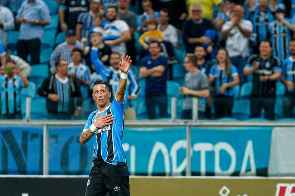 Aos 18, Douglas Coutinho colocou a bola entre as pernas de Geromel, que recuou a bola para o goleiro Marcelo Grohe. Contudo, o arqueiro pegou a bola com a mão. O árbitro assinalou lance livre indireto dentro da área. Na cobrança, Pablo ajeitou para Nikão chutar, mas Ramiro se jogou e a bola explodiu nele.
