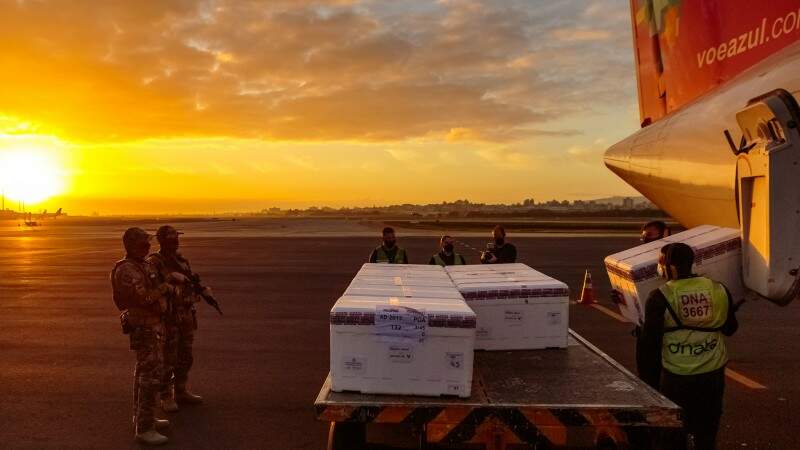 Foto: Gustavo Mansur/Palácio PiratiniO Rio Grande do Sul recebeu na manhã desta sexta-feira (2) a maior remessa de vacinas contra a Covid-19 até o momento. São 600.400 doses de CoronaVac, do Instituto Butantan, e 44.750 da AstraZeneca, produzida pela Fiocruz, totalizando 645.150 enviadas pelo Ministério da Saúde. O carregamento veio em avião ATR-72, da companhia aérea Azul, que pousou às 6h20 no aeroporto Salgado Filho. O maior lote havia sido o primeiro, com 341,8 mil doses, em 18 de janeiro.