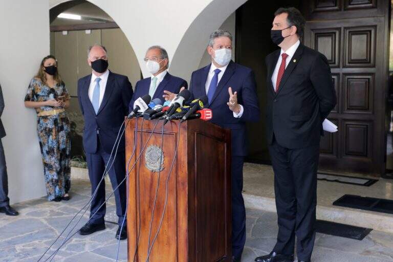 Os presidentes da Câmara dos Deputados, Arthur Lira (PP-AL), e do Senado, Rodrigo Pacheco, se reuniram com o ministro da Economia, Paulo Guedes.