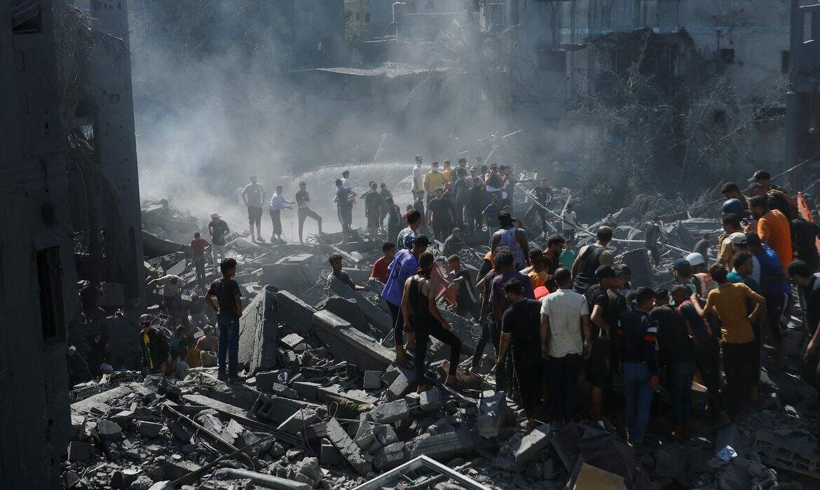 Noutra parte de Gaza, as pessoas procuraram sobreviventes após os ataques aéreos israelenses no bairro de Al-Nasir. Pessoas retiraram um corpo dos escombros enquanto a fumaça subia. Uma mulher gritou. Outros carregaram os feridos.