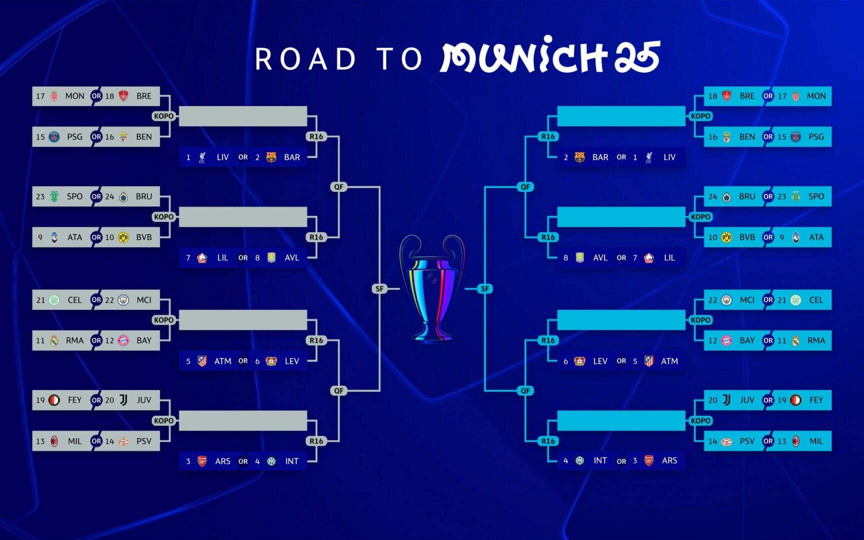Oito clubes já estão classificados diretamente para as oitavas de final, que são: Liverpool, Barcelona, Arsenal, Inter de Milão, Atlético de Madrid, Bayer Leverkusen, Lille e Aston Villa.