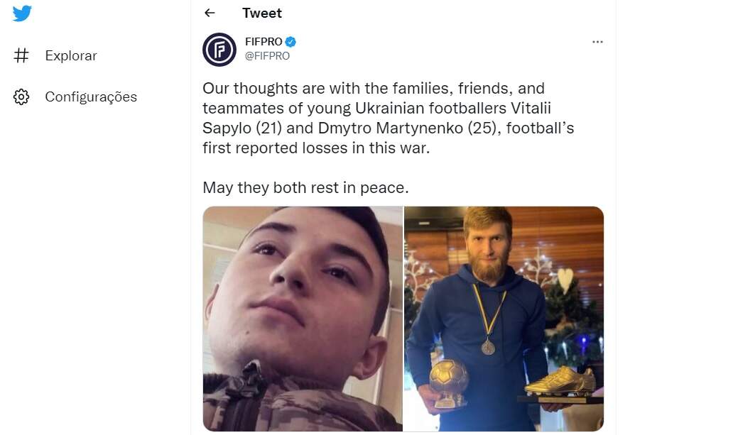 A informação foi confirmada, via redes sociais, em um anúncio da Fifpro (Federação Internacional de Futebolistas Profissionais). “Nossos pensamentos estão com as famílias, amigos e colegas de equipe dos jovens jogadores de futebol ucranianos Vitallii Sapylo (21 anos) e Dmytro Martynenko (25 anos), as duas primeiras derrotas do futebol nesta guerra. Que ambos descansem em paz”, escreveu a entidade.