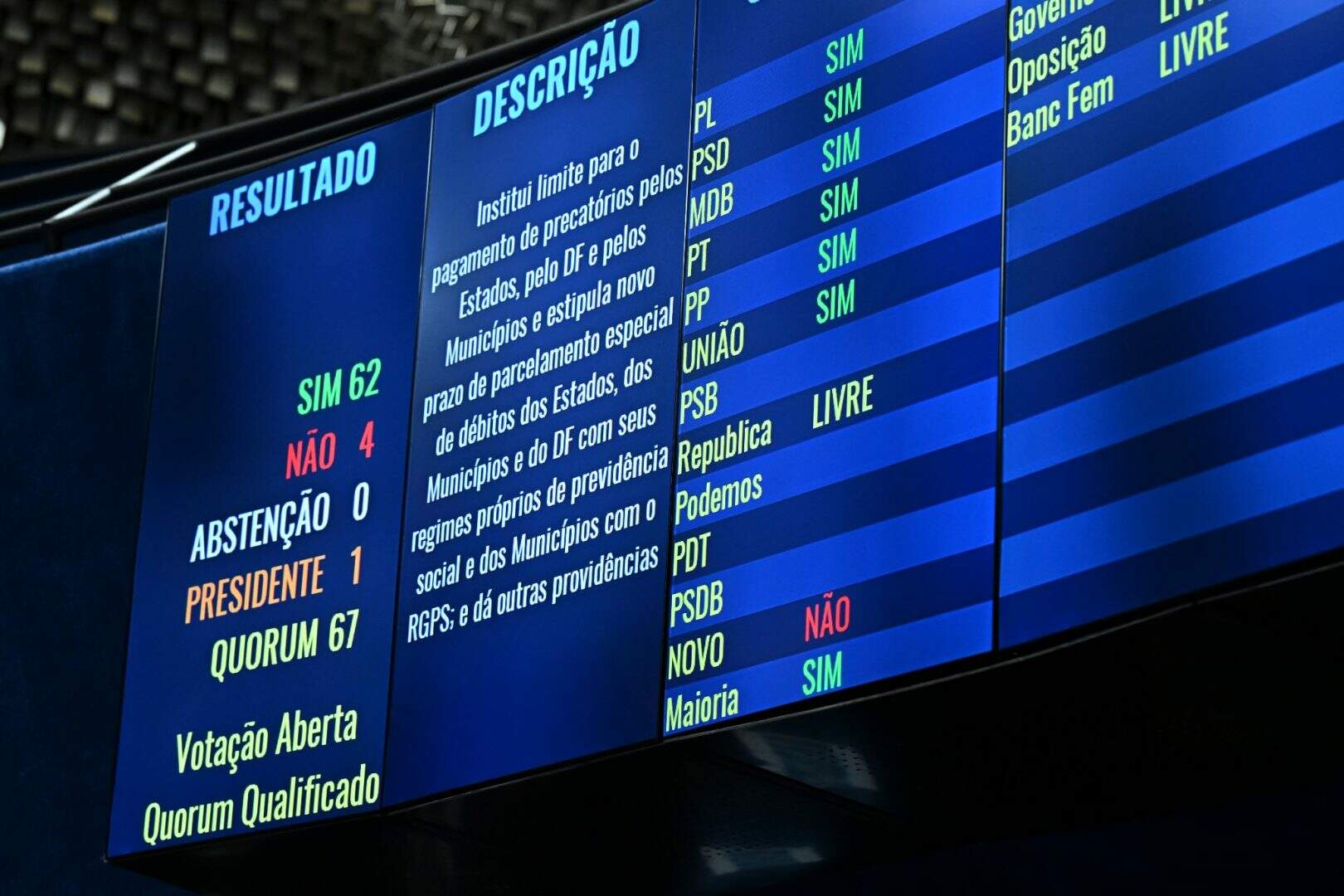 O Senado aprovou ontem, em primeiro turno, o texto-base da proposta de emenda à Constituição que limita o pagamento de precatórios por parte de Estados e municípios e refinancia dívidas previdenciárias. A votação em segundo turno só deve acontecer depois do recesso, em agosto. A votação mobilizou prefeitos de todo o país em torno da Confederação Nacional dos Municípios. A entidade projeta na proposta potencial de aliviar os orçamentos das prefeituras em cerca de R$ 700 bilhões.
