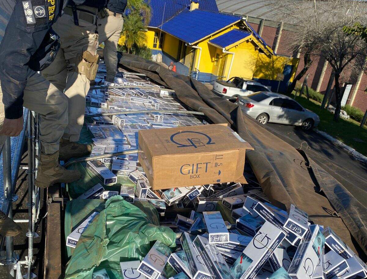 Foto: PRF/DivulgaçãoNa tarde desta quinta-feira (30), a Polícia Rodoviária Federal (PRF) apreendeu quase um milhão de reais em cigarros contrabandeados do Paraguai. A carga foi localizada ao ser transportada em um caminhão na BR-470, em Bento Gonçalves.