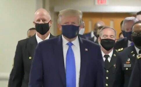 A imagem é de 11 de julho, quando Trump visitou o hospital militar Walter Reed, nos arredores de Washington, e apareceu em público pela primeira vez com a proteção desde o início da pandemia.