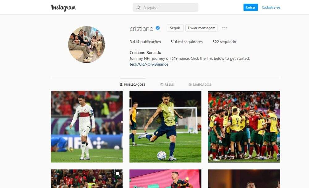 É o caso de Cristiano Ronaldo, astro da seleção portuguesa, que conta com 516 milhões de seguidores no Instagram. A marca foi alcançada durante o torneio – antes, ele tinha 496 milhões de seguidores. Já no Facebook, ele tem 156 milhões de seguidores e, no Twitter, 106 milhões.