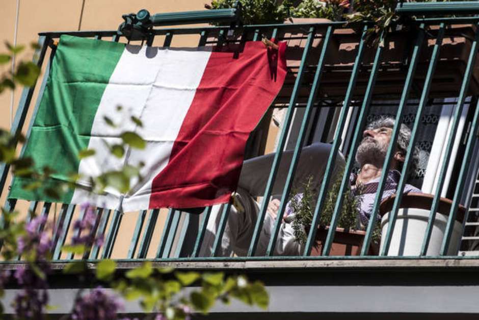 Italiano na sacada do seu apartamento durante o isolamento social em Roma