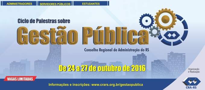 O Conselho Regional de Administração do RS promove, entre os dias 24 e 27 de outubro, em Porto Alegre, o Ciclo de Palestras sobre Gestão Pública. O evento, voltado para Administradores, servidores públicos e estudantes, será realizado por meio de uma parceria com o Tribunal de Contas do Estado, a Escola de Gestão Pública e a Secretaria Municipal de Administração da Prefeitura Municipal de Porto Alegre. As inscrições podem ser realizadas no link http://bit.ly/2dWqiAI.