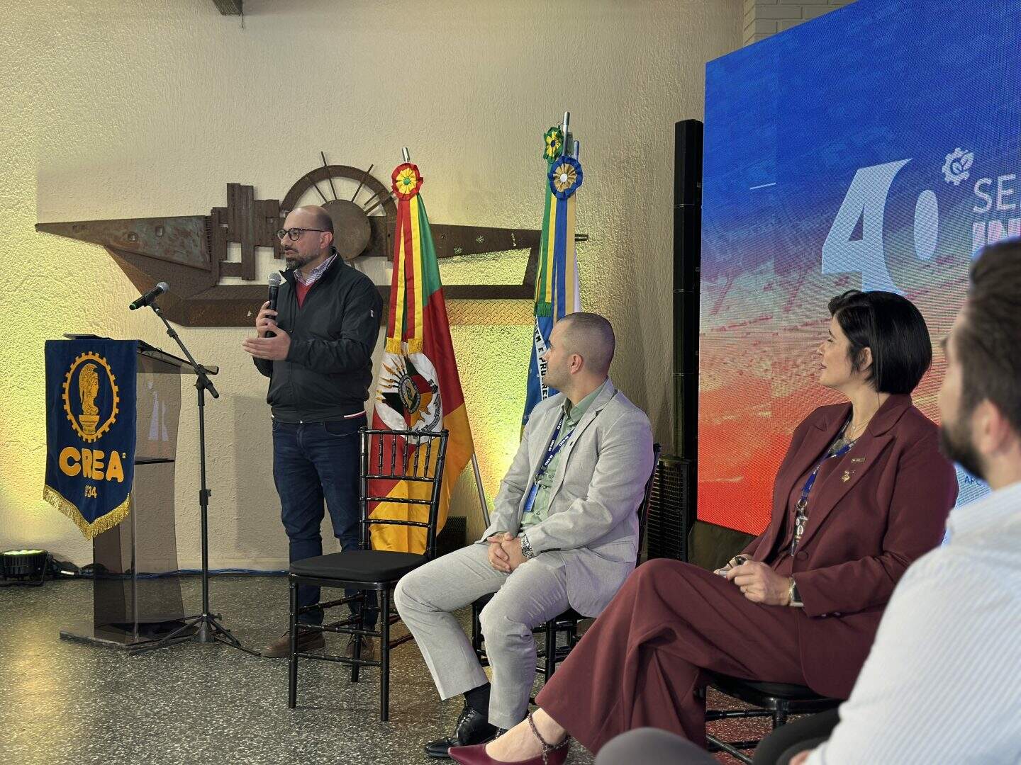 O primeiro dia do seminário também foi marcado por homenagens aos ex-coordenadores das inspetorias, reconhecendo a trajetória de profissionais que contribuíram para a consolidação do colegiado regional. Entre os homenageados estavam o Arq. André Fernando Müller (Cachoeira do Sul), Eng. Amb. Nanci Walter (Esteio), Eng. Mec. Marcos Kercher (Santa Rosa) e o próprio coordenador Gabriel Konig (Palmeira das Missões).