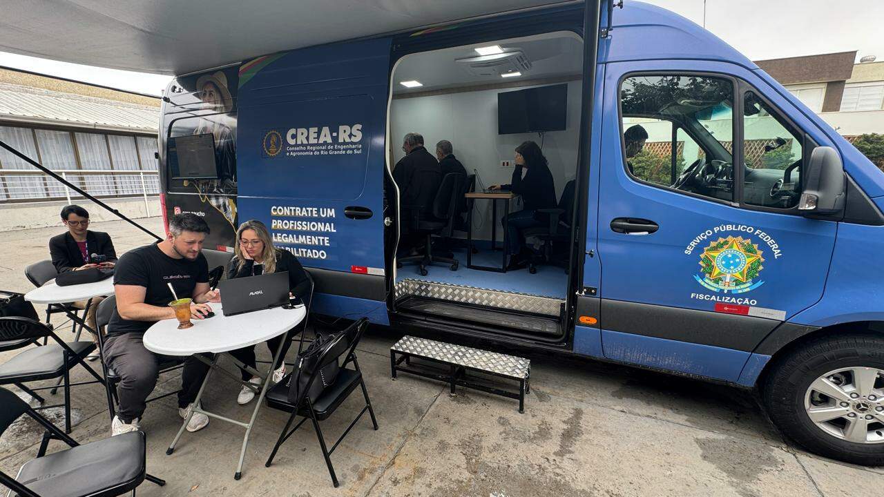 Outro destaque do dia foi a apresentação da Unidade Veicular do CREA-RS, estrutura móvel equipada com internet, energia solar, ar-condicionado, mesas e cadeiras, que funcionará como escritório itinerante para apoio às ações de fiscalização em áreas remotas. A van foi utilizada durante o evento como ponto de atendimento e suporte aos profissionais, reforçando o compromisso do Conselho com a presença ativa em todas as regiões.