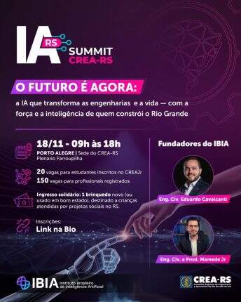 Foto: ReproduçãoNo dia 18 de novembro, o Crea-RS realiza o 1º Summit de Inteligência Artificial, um evento totalmente dedicado à discussão e aplicação prática da IA nas engenharias, agronomia e geociências. Ao longo de todo o dia, especialistas irão conduzir palestras e painéis com foco no uso estratégico e responsável da inteligência artificial