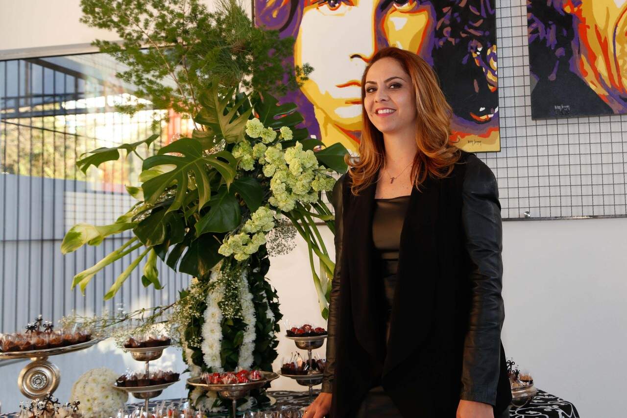 Jaqueline Sant’Anna Pegoraro durante a montagem do cenário, com a participação do Clube Arte Flores, no Espaço Maestro, que Tiago Perlott acaba de abrir na zona Sul . (Foto: Lenara Petenuzzo/especial)