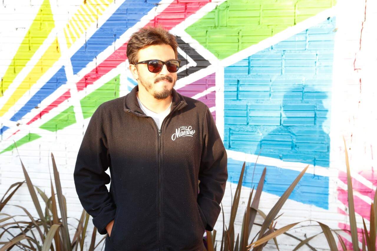 Tiago Perlott junto ao grande painel que ocupa uma das paredes do Espaço Maestro. (Foto: Lenara Petenuzzo/especial)