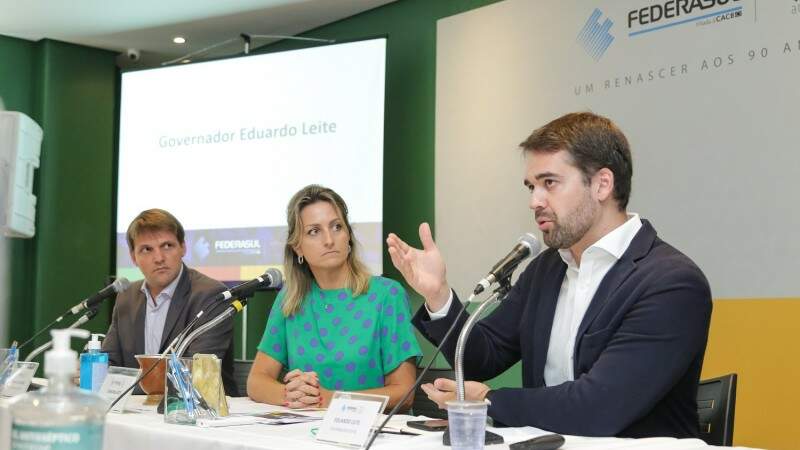 Foto: Gustavo Mansur /Palácio PiratiniO governador Eduardo Leite participou, no final da manhã desta quarta-feira (18), da reunião de integração do mês de março da Federasul (Federação de Entidades Empresariais do Rio Grande do Sul).