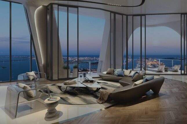 O edifício foi projetado pela arquiteta Zaha Hadid (1950-2016) e tem uma aparência moderna, com grandes salas abertas e vista para a cidade e para o mar. O apartamento tem cinco quartos, piscina própria e um heliponto.