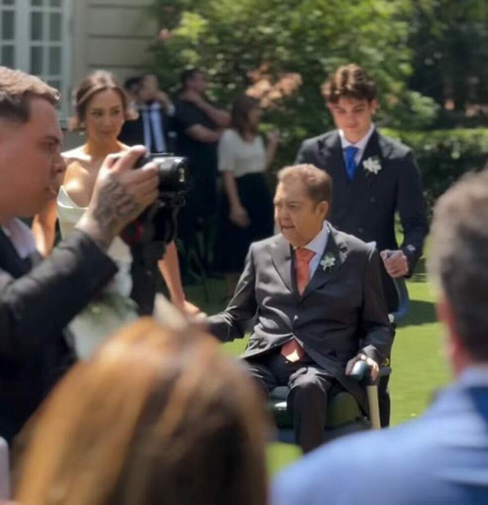 Em imagens publicadas pelo filho, João Silva, Faustão aparece de cadeira de rodas, de mãos dadas com a noiva. O filho mais novo, Rodrigo Silva, ajudou a levar a cadeira.