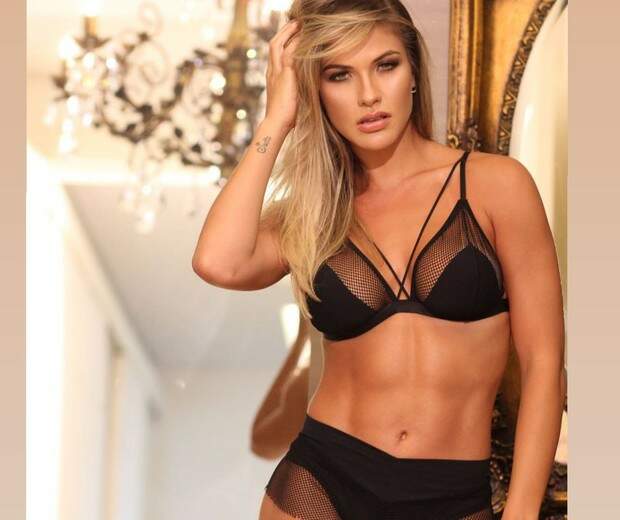 Com um clique de lingerie e ainda loira, ela exibiu a silhueta, com direito a tanquinho à mostra, e explicou que o clique foi antes de se tornar mãe de dois: “antes de ter filhos”.
