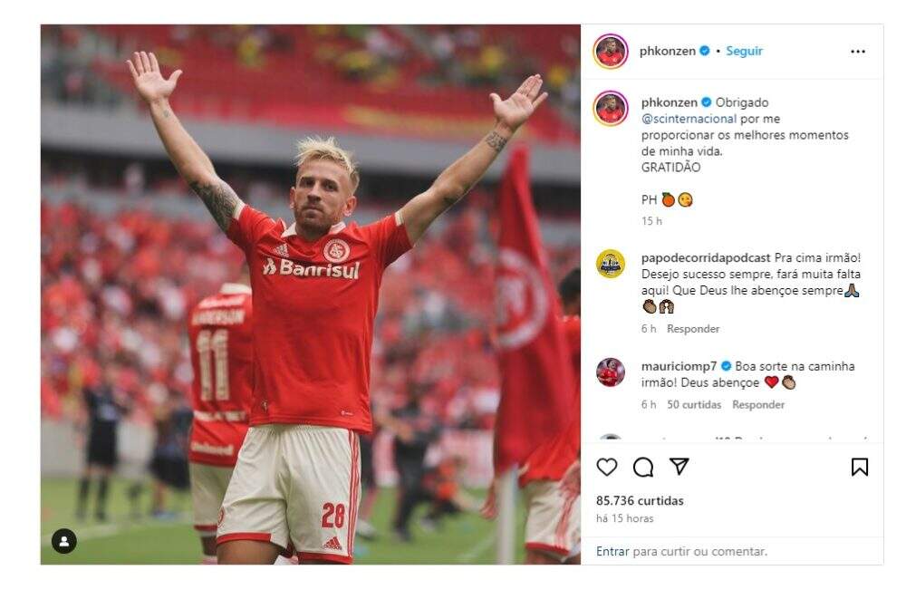O atacante Pedro Henrique utilizou suas redes sociais para se despedir da torcida colorada. O jogador, de 33 anos, está acertado com o Corinthians.