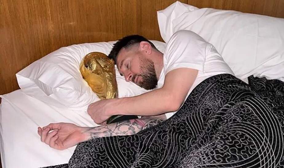Foto: Reprodução/Redes SociaisParece que Lionel Messi não quer mesmo desgrudar da Copa do Mundo. A taça conquistada pelo Argentina, no último domingo, passou, pelo menos uma noite, na cama dele. Messi “dormiu com o troféu” e publicou uma foto em suas redes sociais. Mais de 20 milhões de pessoas curtiram sua postagem até agora.