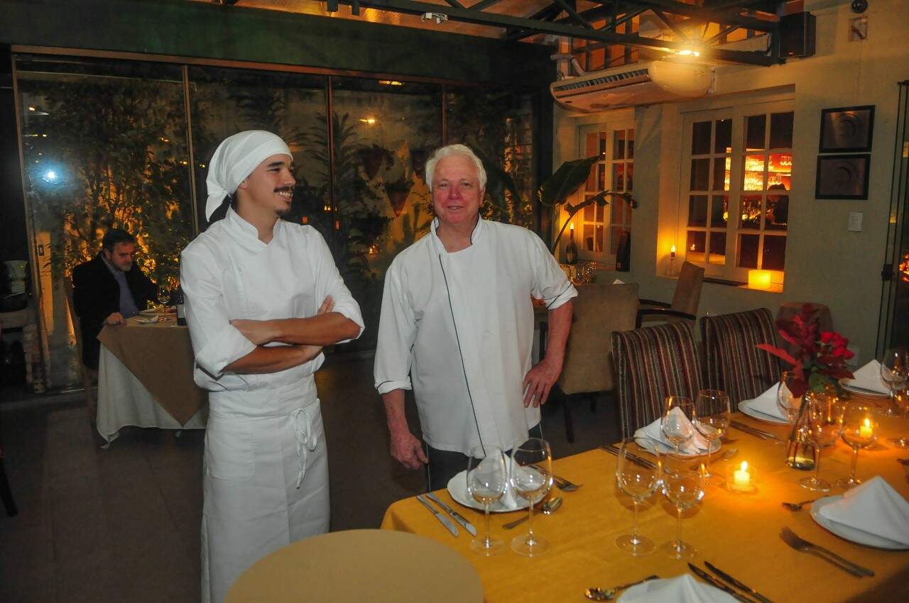 Cauê Durand e o pai, o chef Gerard Durand, durante a acolhida aos clientes no bonito jardim de inverno. (Foto: Livia Stumpf/especial)