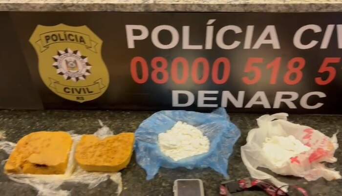 Foto: PC/DivulgaçãoA Polícia Civil apreendeu na noite desta sexta-feira (15), em Sapucaia do Sul, na Região Metropolitana de Porto Alegre, 44kg de maconha, 200g de cocaína e 1.6 kg de crack. O veículo utilizado para entrega dos entorpecentes também foi apreendido. Duas pessoas foram presas em flagrante pelos crimes de tráfico de drogas e associação para o tráfico.