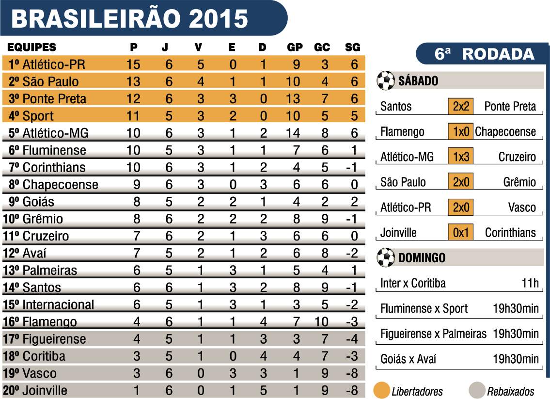 A sexta rodada começou com seis jogos neste sábado (6) pelo Brasileirão. O Atlético-PR venceu por 2 a 0, em Curitiba, o Vasco e segue líder da competição, com 15 pontos.