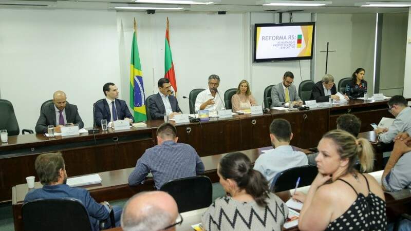Foto: Gustavo Mansur/Palácio PiratiniO governo do Estado esteve, nesta terça-feira (14), na Assembleia Legislativa, para mais uma rodada de conversa sobre os projetos que integram a Reforma RS – conjunto de medidas para enfrentar a crise fiscal do Estado. O encontro contou com a presença do secretariado responsável pelo assunto, 14 deputados e representantes de 12 bancadas que compõem a base aliada.