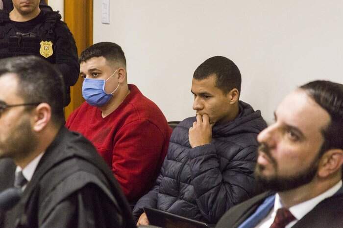 Os réus Peterson (D) e Vinicius (de vermelho) durante o júri em Charqueadas.