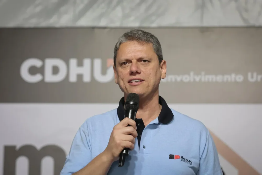 Tarcísio participou da entrega de unidades habitacionais em Embu das Artes. Além dele, também estava presente o prefeito de São Paulo, Ricardo Nunes (MDB).