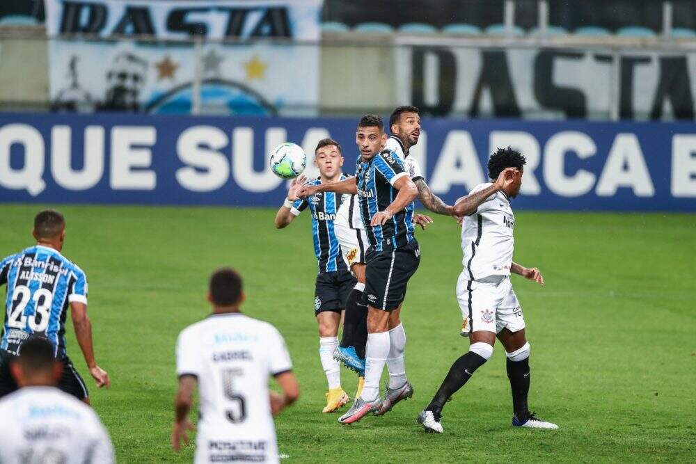 O Grêmio começou bem a partida, pressionando o time paulista e criando as primeiras oportunidades. Logo aos 3 minutos, chegou com um cruzamento de Orejuela para Pepê. O atacante acionou Jean Pyerre no campo de ataque, mas o Corinthians ficou com a bola. Quatro minutos depois, foi a vez de Geromel cruzar na cabeça de Pepê, que desviou por cima do gol.