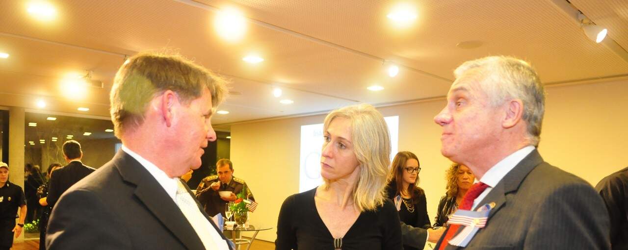 Dennis Hankins, que assume a embaixada dos EUA na República da Guiné, comentou com Alejandra Espósito e o marido, Carlos Garcia Baltar, cônsul-geral da Argentina, seu entusiasmo pela África, durante o coquetel que celebrava a independência americana na capital. Foto: Livia Stumpf/Especial