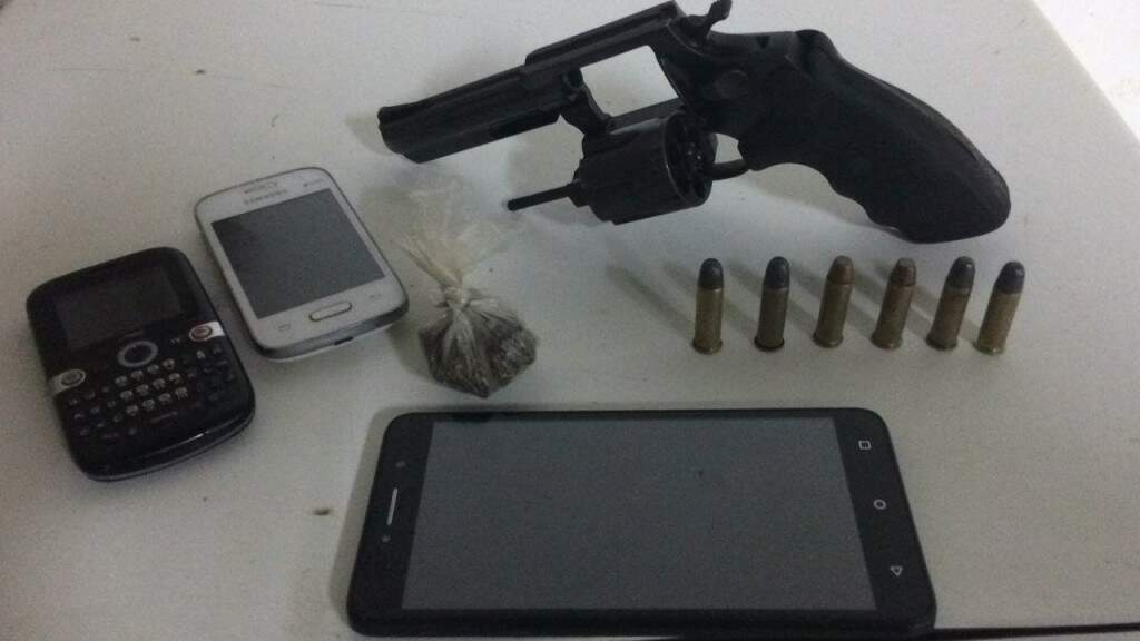 Foram presos J. Z. O. e D. R. S. B. e apreendido um adolescente. Com eles foram achados um revólver da marca Rossi, calibre 38, numeração suprimida e municiado com seis cartuchos intactos.