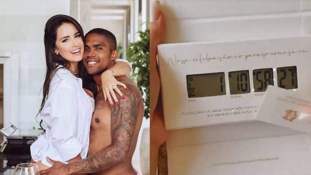Os convidados não terão desculpa para perder a hora do casamento do jogador Douglas Costa com Nathália Felix, nesta quarta-feira (14), em Punta Cana, na República Dominicana, tendo o Mar do Caribe como cenário. O convite distribuído vem dentro de uma caixinha personalizada, com areia de praia e um relógio com contagem regressiva. O luxo não para por aí. O seleto grupo de convidados também recebeu uma mala para a viagem, com as iniciais dos noivos escritas e um balão em formato de coração no seu interior.