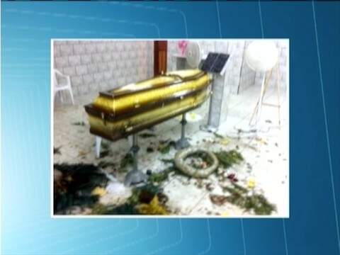 Ainda segundo informações da PM, o velório foi invadido por volta de 0h30min. De acordo com testemunhas, familiares da vítima estavam na igreja onde o corpo era velado, quando dois homens chegaram e pediram para a família se afastar. Em seguida, eles atiraram no caixão, picharam as paredes com frases de ofensas e ameaças e colocaram fogo no local.
