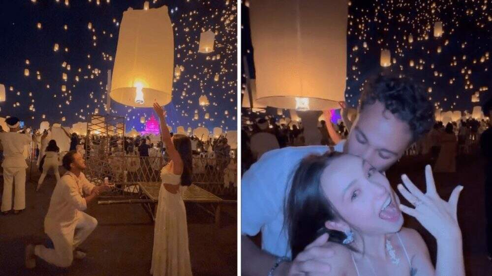 No domingo (17), Larissa Manoela e André Luiz Frambach compartilharam um momento romântico durante o Festival de Lanternas, na Tailândia, onde a atriz foi pedida em casamento novamente.