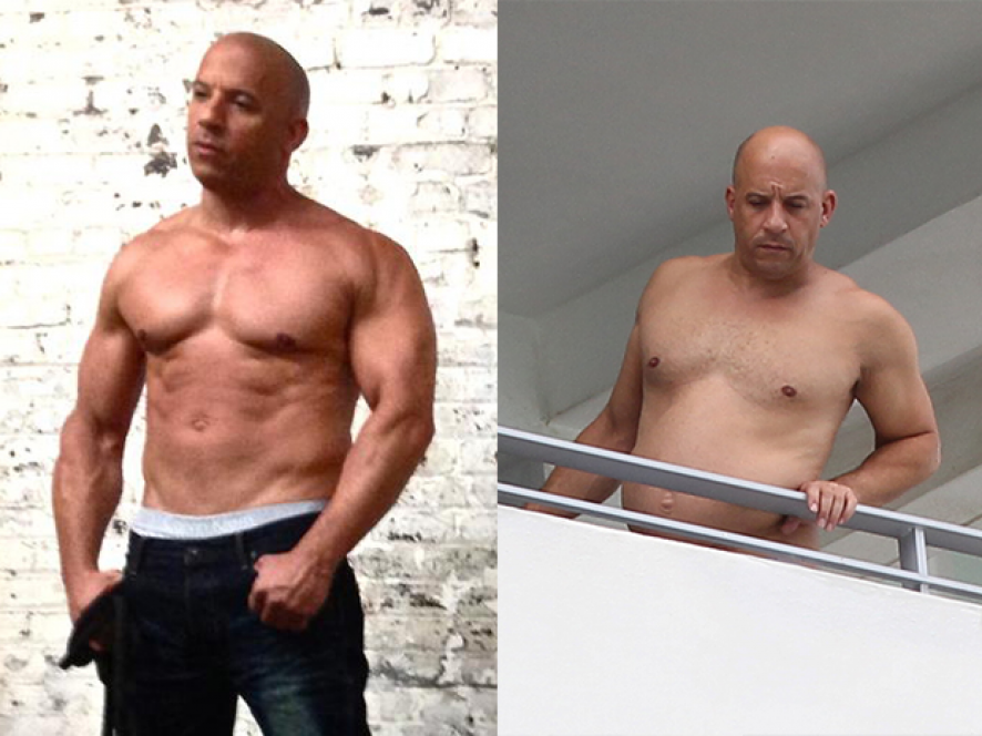O ator Vin Diesel foi fotografado na sacada de um prédio em Miami, nos Estados Unidos, e nem de longe lembrava o ator saradão da saga “Velozes e Furiosos”. Ele estava sem camisa, todo relaxado e exibiu uma barriguinha, que fez desaparecer todos os seus famosos gominhos.