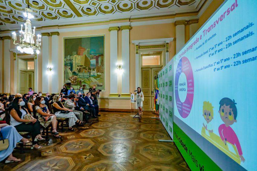 Foto: Alex Rocha/PMPAO prefeito em exercício de Porto Alegre, Idenir Cecchim, e a secretária municipal de Educação, Janaina Audino, apresentaram, nesta quarta-feira (16), no Paço Municipal, o Programa Mais Tempo na Escola. Cinco escolas municipais de ensino fundamental terão atendimento integral neste ano letivo, que começa na próxima segunda-feira (21). Todas as atividades pedagógicas serão ministradas por professores da rede municipal. Ao todo, cerca de 1,6 mil estudantes serão atendidos nove horas diárias, com cinco refeições.