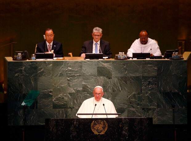 O Papa Francisco discursou hoje na Assembleia Geral da Organização das Nações Unidas (ONU), em Nova York (EUA). Ele criticou os órgãos financeiros internacionais e o uso indiscriminado do planeta que prejudica a natureza e os mais pobres. A presença do Papa marca a celebração dos 70 anos da Assembleia Geral.