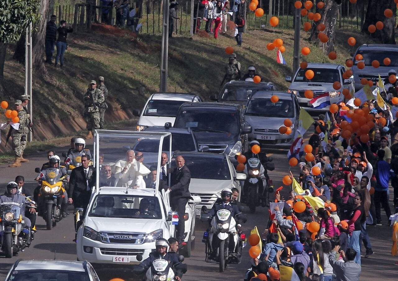 Desde que o pontífice chegou ao Paraguai nesta sexta-feira (10), procedente da Bolívia, sua agenda esteve repleta de atos, aos quais se deslocou em sua maioria no papamóvel. (Mariana Carneiro/Folhapress)