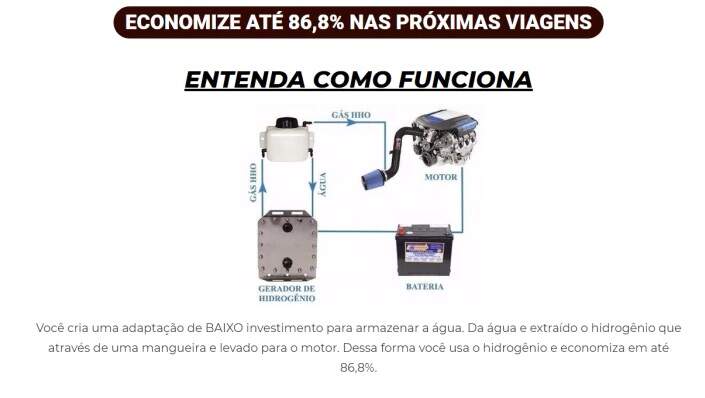 Os vídeos mais populares ultrapassam as 2,3 milhões de visualizações. Os perfis que publicam esses conteúdos promovem links para sites nos quais é vendido um curso que ensinaria a modificar o motor para alimentá-lo apenas com água. Em alguns casos, as postagens prometem uma eficiência de 650 km com um litro – com isso, daria para ir do Chuí, no extremo sul do País, ao Oiapoque, no extremo norte, com menos de dez litros de água. As postagens foram checadas pela plataforma Estadão Verifica, serviço de verificação de informações do jornal O Estado de S. Paulo.