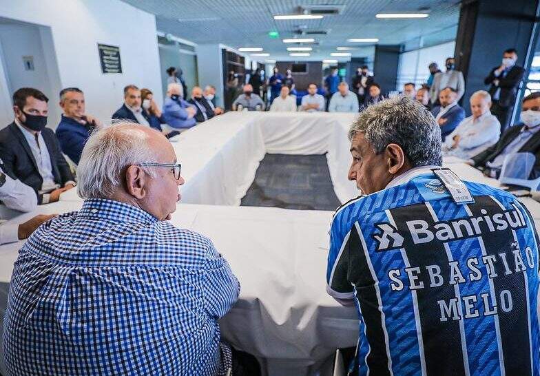 O prefeito Sebastião Melo foi recebido na tarde desta quinta-feira (4) na Arena do Grêmio, Zona Norte de Porto Alegre, pelo presidente do clube Romildo Bolzan Júnior. Na pauta, as obras de infraestrutura no entorno do estádio, melhorias de mobilidade na região e parcerias com o clube em iniciativas como revitalização da orla do Guaíba e vacinação contra o coronavírus.