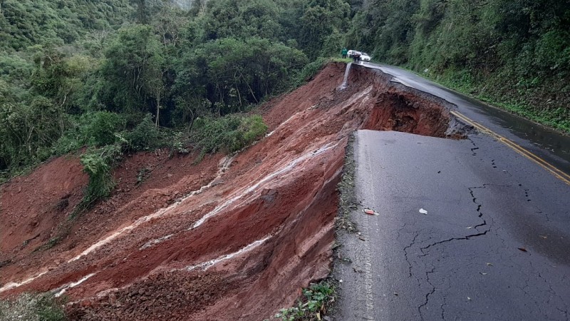 Foto: Divulgação CRBMOs temporais que atingiram o Rio Grande do Sul desde terça-feira (30) provocaram alterações no trânsito de rodovias estaduais de diversas regiões. Além da queda de barreiras e de parte da pista da ERS-448, na Serra, a cheia dos rios também deixa em alerta os órgãos responsáveis pelas estradas. Com bloqueio total após a queda de uma das pistas no km 39, a ERS-448 terá emergência decretada para agilizar as obras de recuperação do pavimento.