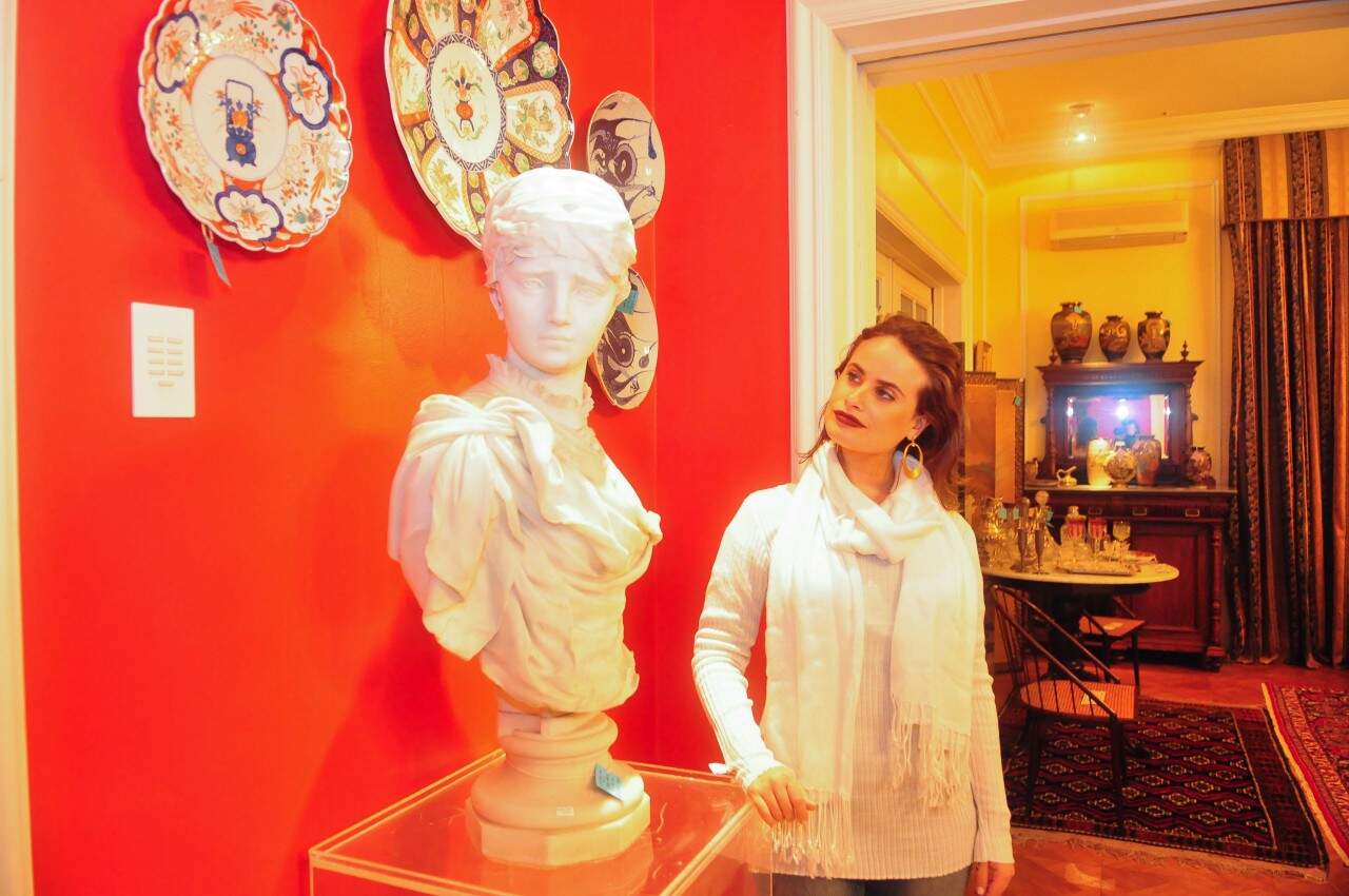 Marta Richter Dienstmann esteve visitando a exposição do acervo cujo primeiro leilão será hoje. Ente os itens que admirou, a grande tapeçaria de Aubusson que ostenta um brasão da família nobre para a qual foi executada e possui as bordas integradas aos motivos da ornamentação, o que é pouco comum. Foto: Livia Stumpf/Especial