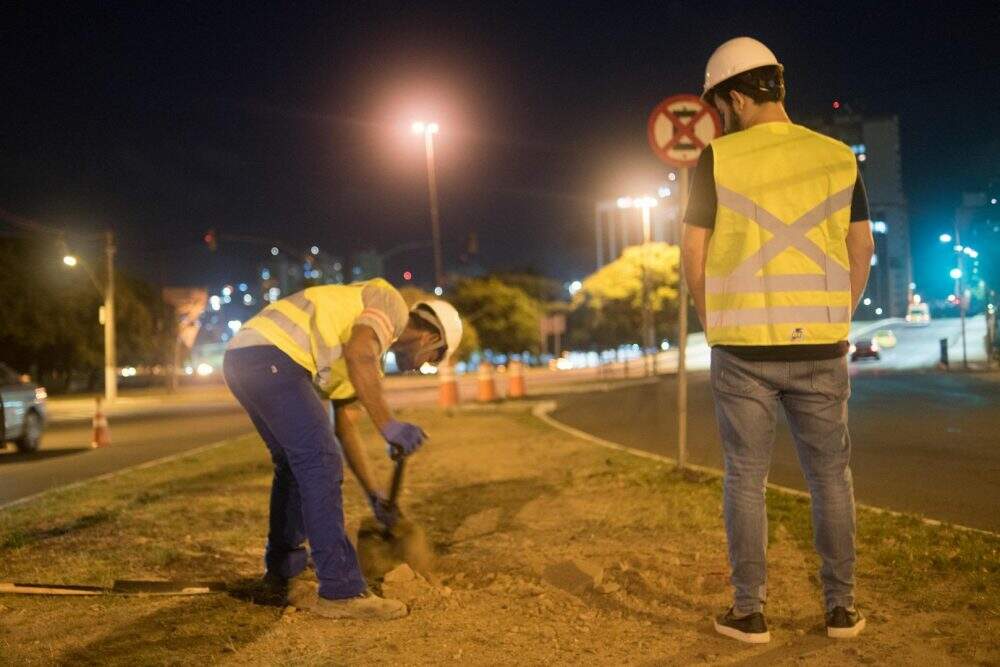As fundações são executadas no turno da noite, para que não haja impacto significativo no trânsito de veículos e pedestres, já que alguns locais de intervenção estão localizados em canteiros.