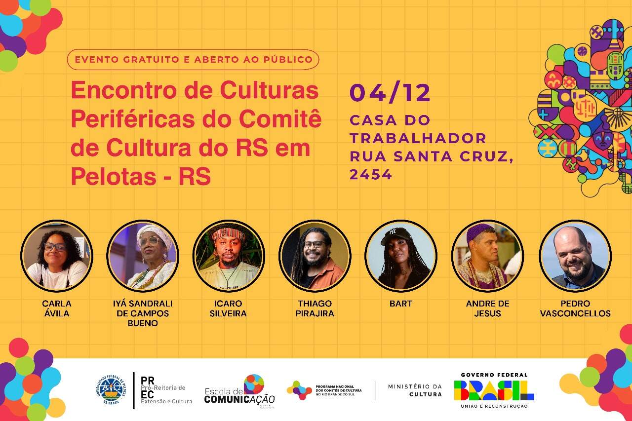 Multiplicar a informação, promover o diálogo e ampliar os acessos às políticas de fomento à cultura são alguns dos principais objetivos do “Encontro de Culturas Periféricas”, promovido pelo Comitê de Cultura no RS em parceria com a Ufpel (Universidade Federal de Pelotas), por meio da PREC (Pró-Reitoria de Extensão e Cultura), e que acontecerá pela primeira vez em Pelotas.