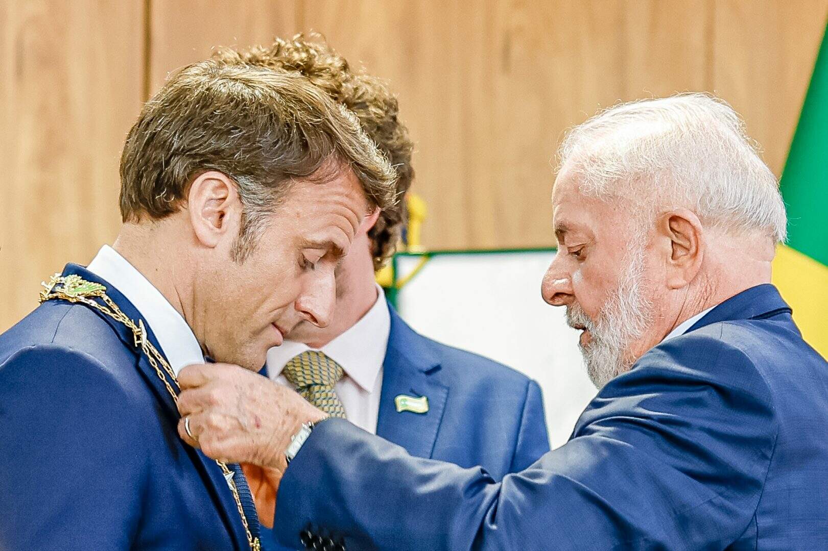 Macron, por sua vez, entregou à primeira-dama Janja da Silva a insígnia da Ordem Nacional da Legião de Honra no grau de Oficial.